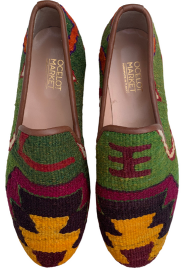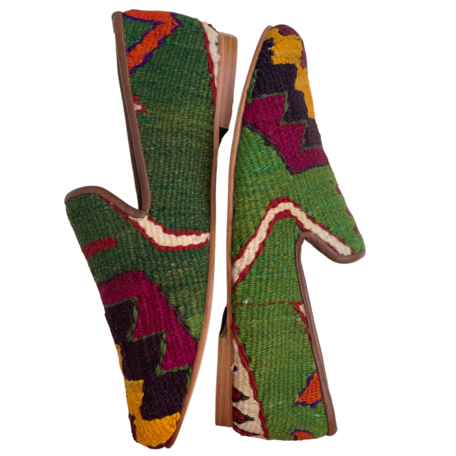 Handmade wool kilim rug upper with a leather sole and leather lining. This style is made from a repurposed 40+ year old Turkish kilim rug and each design is one-of-a-kind.