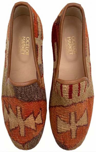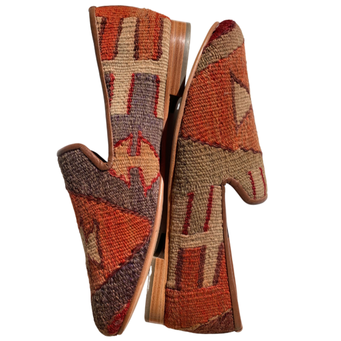 Handmade wool kilim rug upper with a leather sole and leather lining. This style is made from a repurposed 40+ year old Turkish kilim rug and each design is one-of-a-kind.