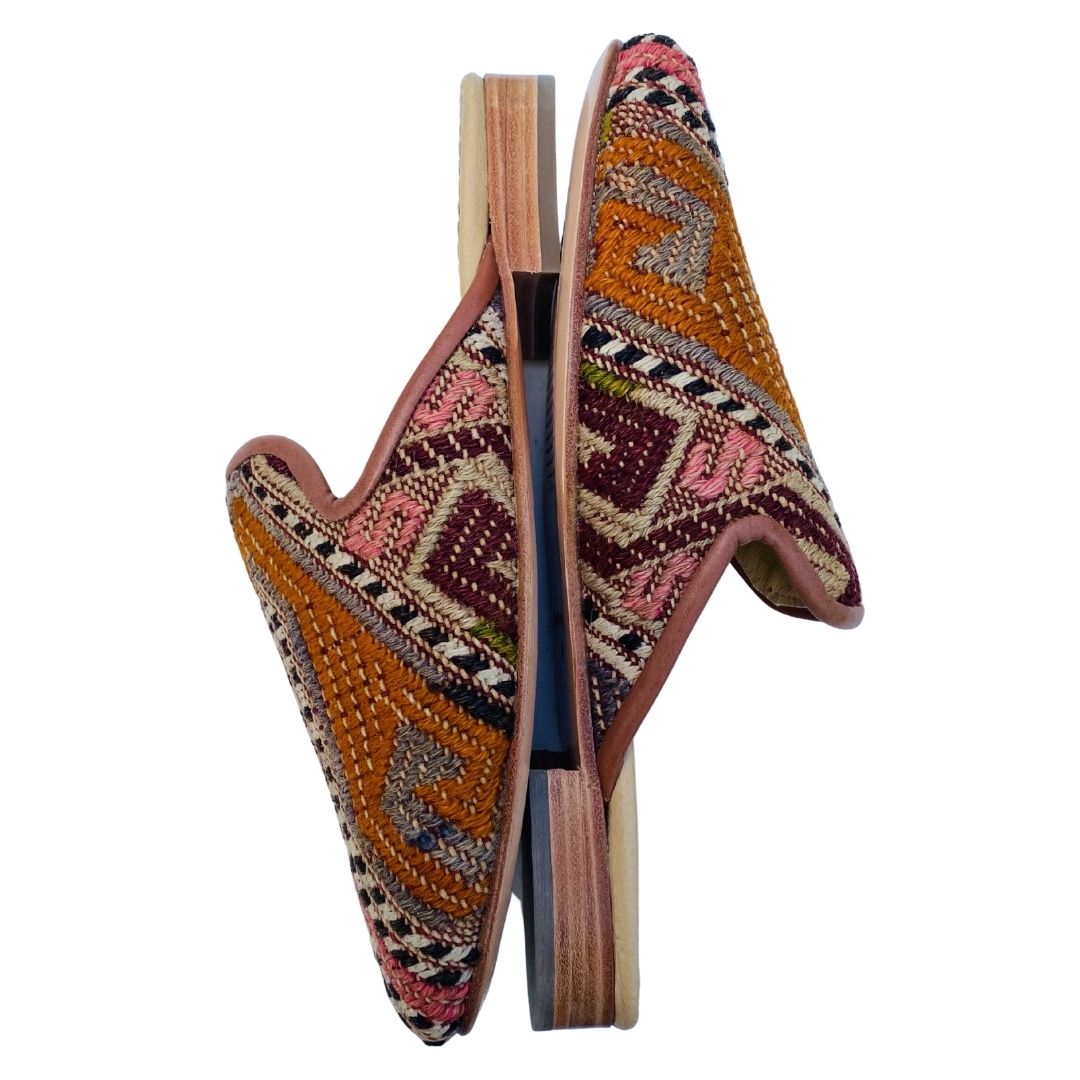 Handmade wool kilim rug upper with a leather sole and leather lining. This style is made from a repurposed 40+ year old Turkish kilim rug and each design is one-of-a-kind.